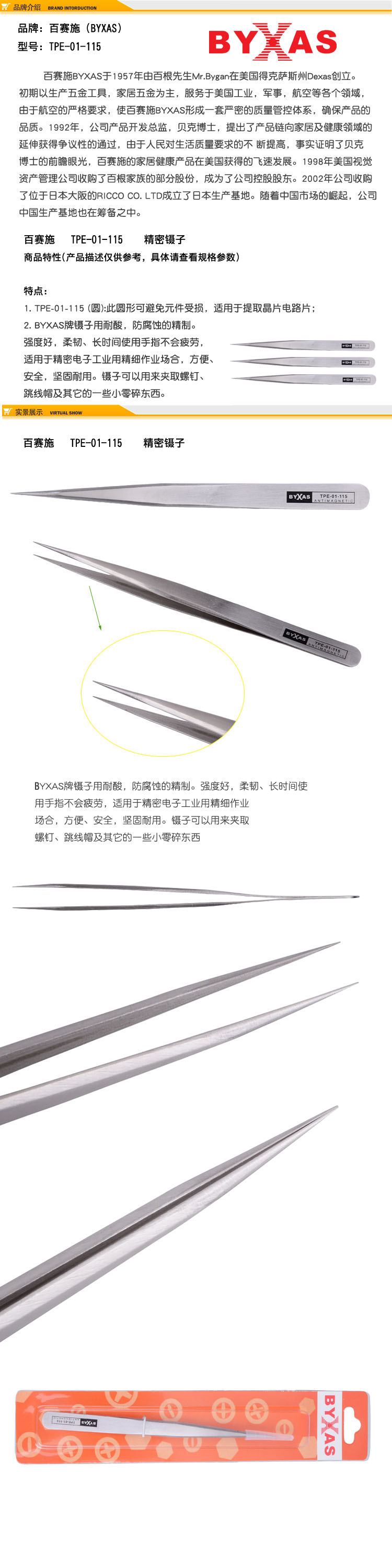 百賽施不銹鋼防靜電優質精密鑷子TPE-01-115