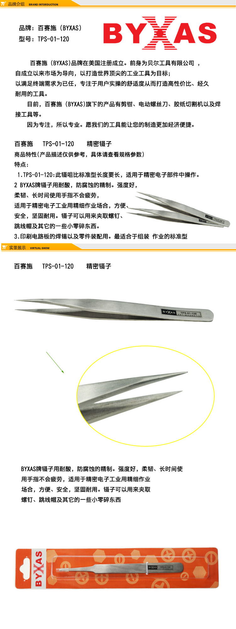百賽施不銹鋼防靜電優質精密鑷子TPS-01-120