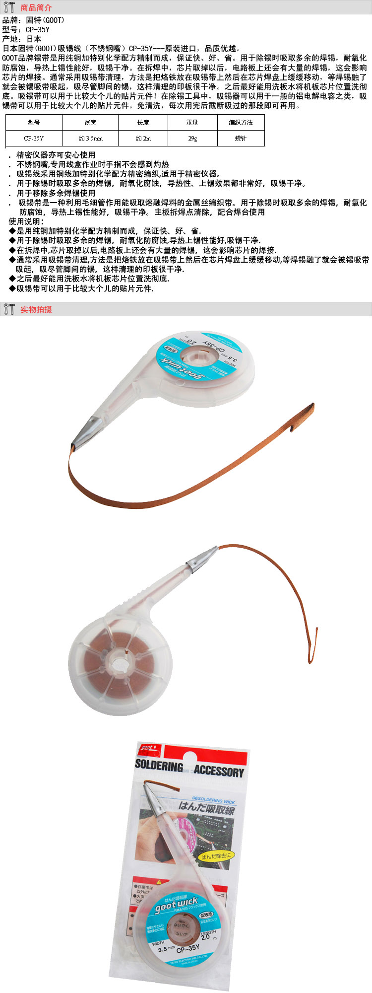 GOOT日本吉歐歐替 吸錫線(不銹鋼嘴)CP-35Y