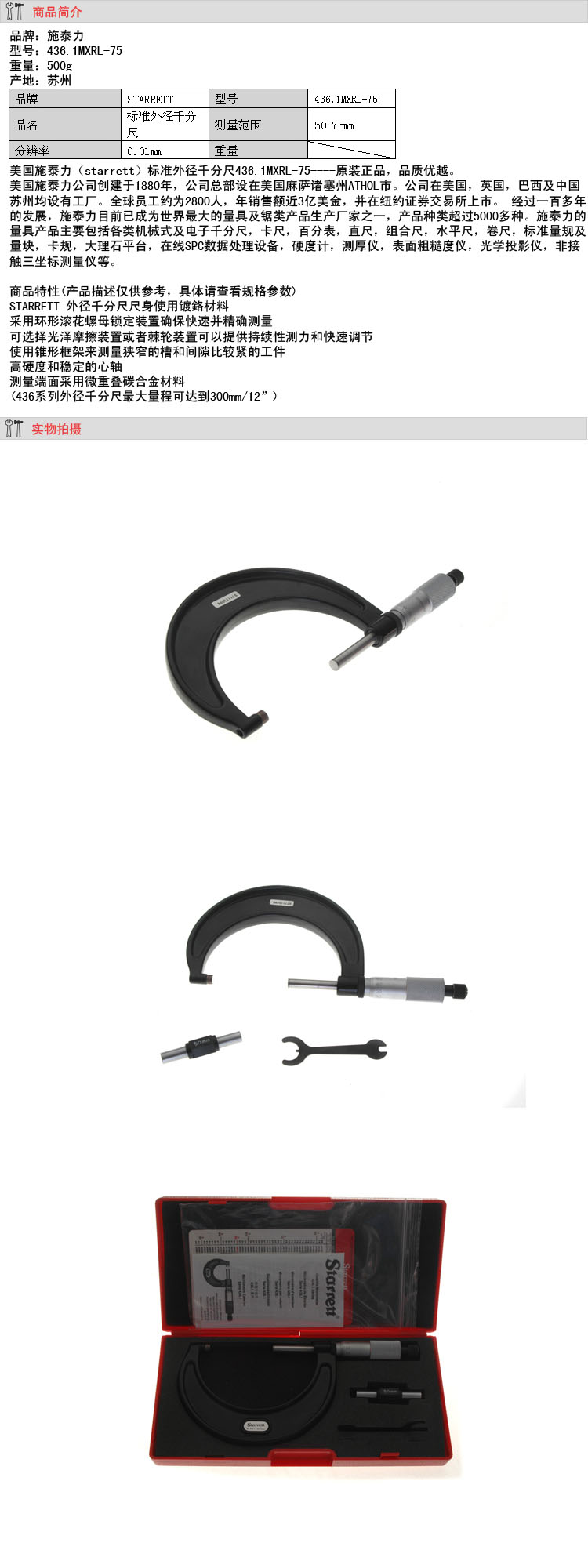 施泰力(Starret)標(biāo)準(zhǔn)外徑千分尺 436.1MXRL-75