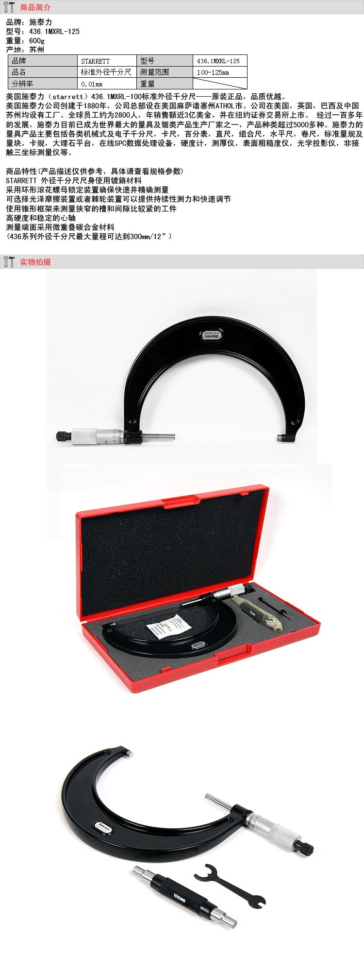 施泰力(Starret)標準外徑千分尺 436.1MXRL-125