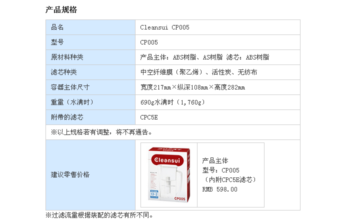 日本原裝進(jìn)口可菱水(Cleansui)家用凈水器 CP005E