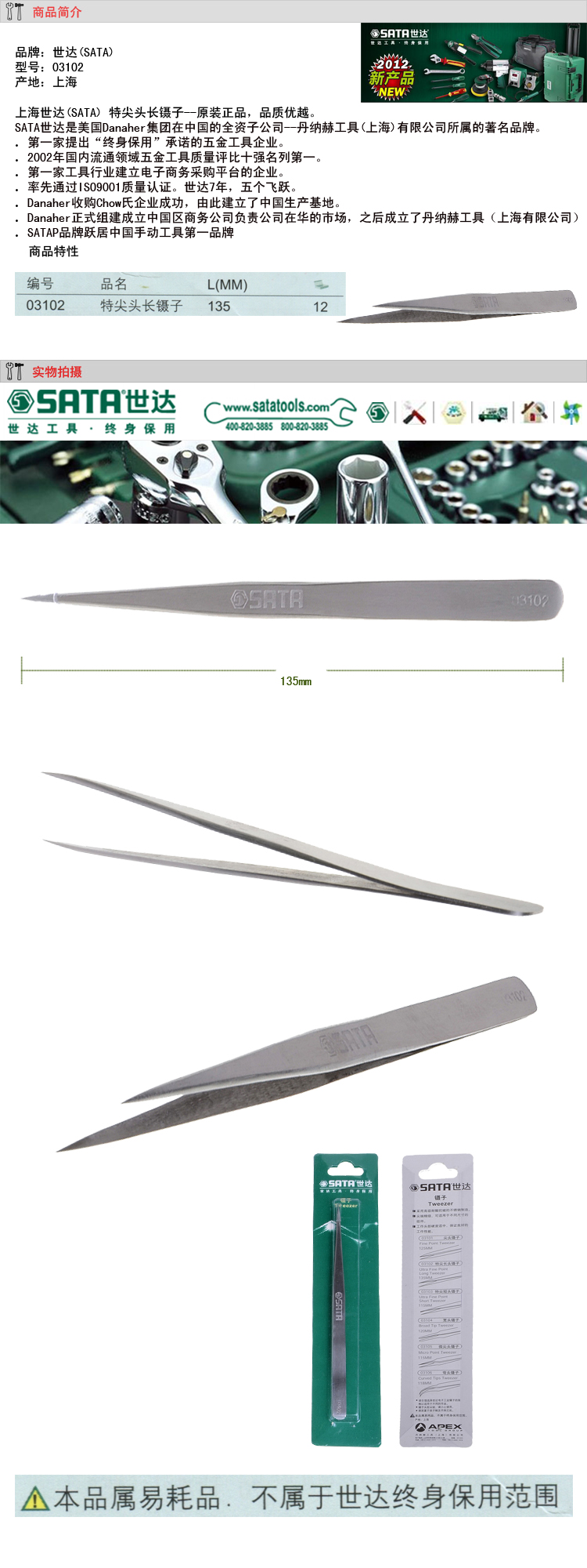 SATA世達特尖頭鑷子03102