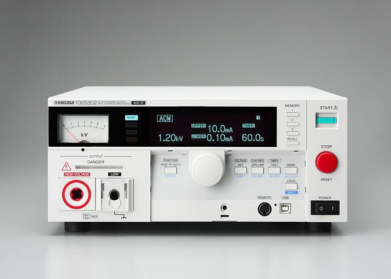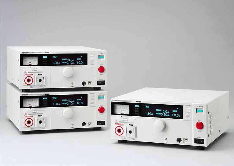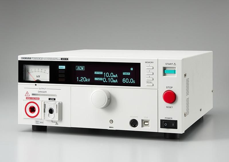 [TOS5300系列」是對電器產品必須進行安全確保4項測試中的耐電壓測試,絕緣阻抗測試的測試儀器。輸出為5kV/100mA(AC),6kV/10mA(DC),基于在IEC,EN,UL,VDE,JIS等各國安全規(guī)定或電器產品安全法的要求之上,可對電子器械,電子部品進行耐電壓/絕緣阻抗測試。還有,采用了最新研發(fā)的開關放大器,使測試電壓的安定性更高。因為不受AC輸入端電壓和頻率變化的影響,可保持安定的輸出電壓,所以在電源環(huán)境不安定的區(qū)域也可進行安定,安心的測試。裝備有充實的對應各式各樣用戶要求的機能。這是一款基于操作性·實用性·安全性·低價格為一體,性價比高的新機種。